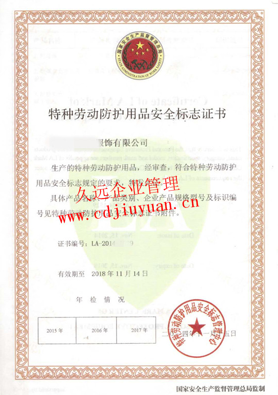 勞動防護用品安全標(biāo)志認(rèn)證證書